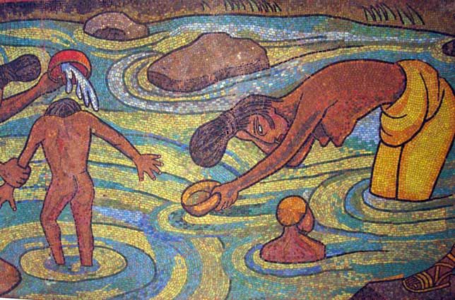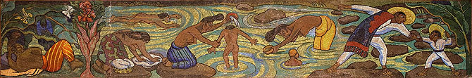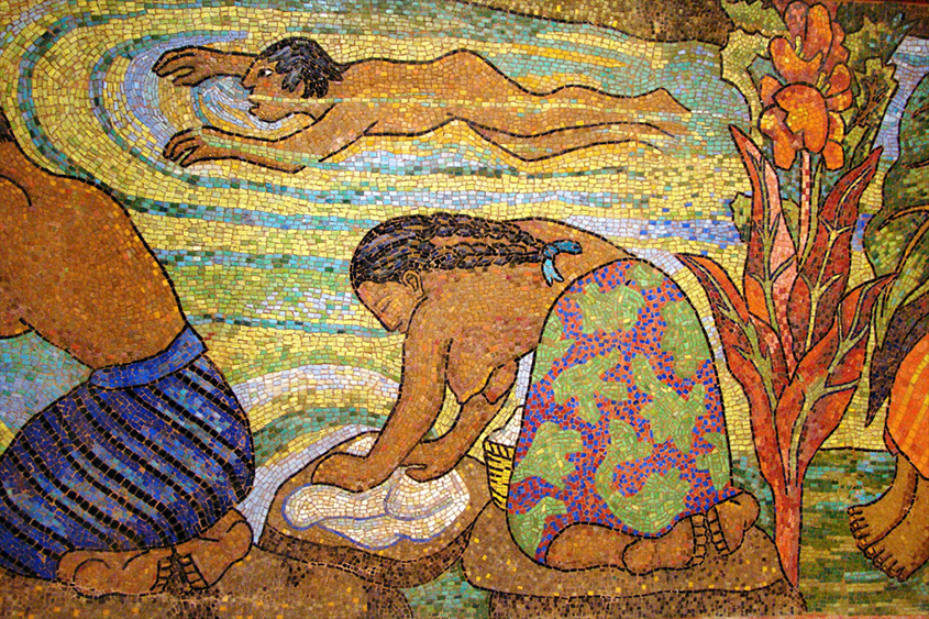 Rivera eligió la técnica del mosaico veneciano, milenaria en Europa y reinventada en sus manos para cantar la belleza de un país. Pequeñas teselas de vidrio y piedra, diminutos fragmentos de eternidad, se unieron para formar un mural que parece líquido, que parece viento. Cada brillo, cada destello de luz, evoca la vibración del río, la risa de las mujeres tehuanas bañándose entre telas que ondean como banderas de libertad.