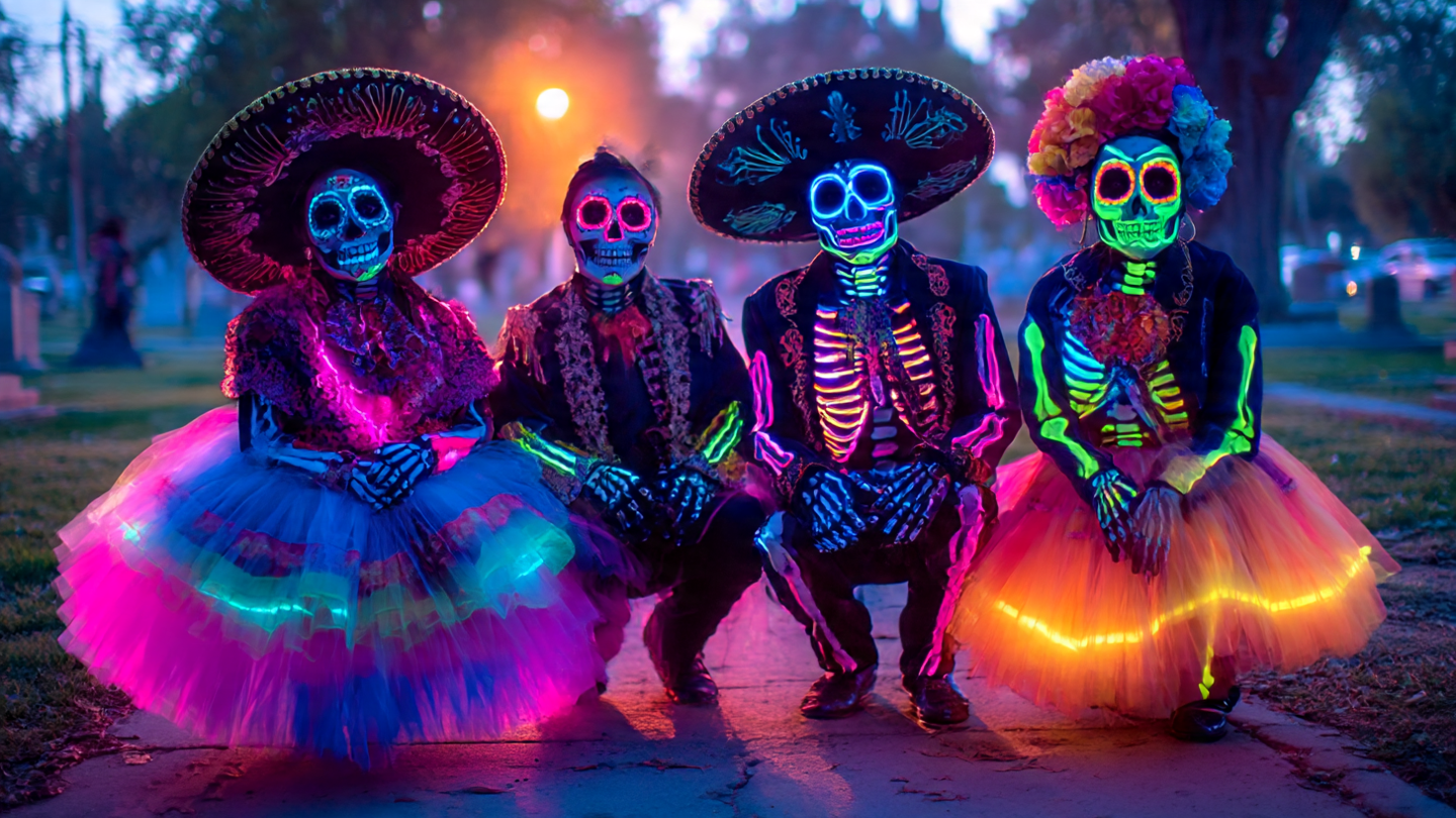 Las tendencias lo confirman: la Catrina moderna ya no se conforma con flores en el cabello y cara pintada. Ahora lleva maquillaje glow-in-the-dark, tutús de papel picado y una actitud que mezcla elegancia con irreverencia. A su lado aparece el Charro Fantasma, traje negro, sombrero bordado con hilo plateado y botas que, al caminar, suenan como si crujieran huesos. Cada paso es una reverencia a la muerte, pero también una carcajada ante ella.