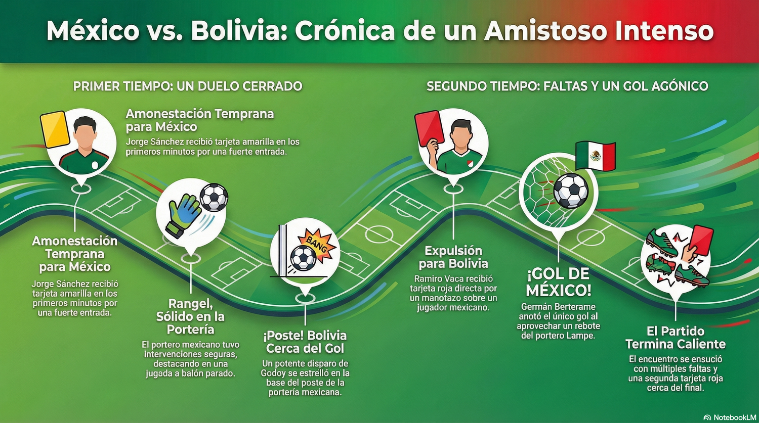 La Selección Mexicana «B» superó por la mínima diferencia a su similar de Bolivia en un encuentro marcado por la rispidez y el oportunismo. Germán Berterame definió el marcador al aprovechar un error técnico del arquero Carlos Lampe, quien «agarró gallinas» en un centro de rutina, permitiendo al delantero de Rayados firmar el triunfo con viveza dentro del área chica. Este partido, diseñado como un laboratorio para Javier Aguirre, expuso tanto la capacidad de reacción del plantel alternativo como las fracturas emocionales que el equipo aún no logra sanar.
